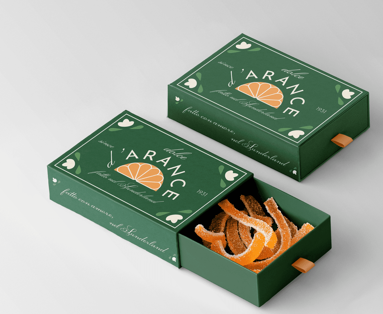 Para este proyecto desarrollé una propuesta para realizar un packaging premium para el producto Dolce d’Arance. La propuesta toma como punto de partida unos dulces artesanales de naranja, conocidos como “naranjitas”, que el Sunderland Bar obsequia a sus clientes más especiales.
